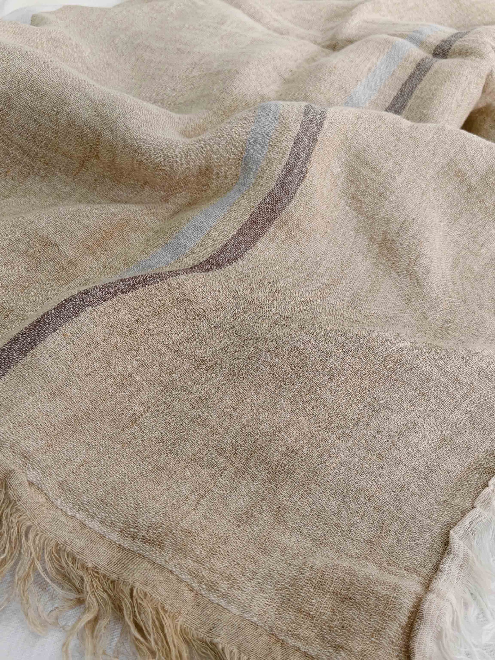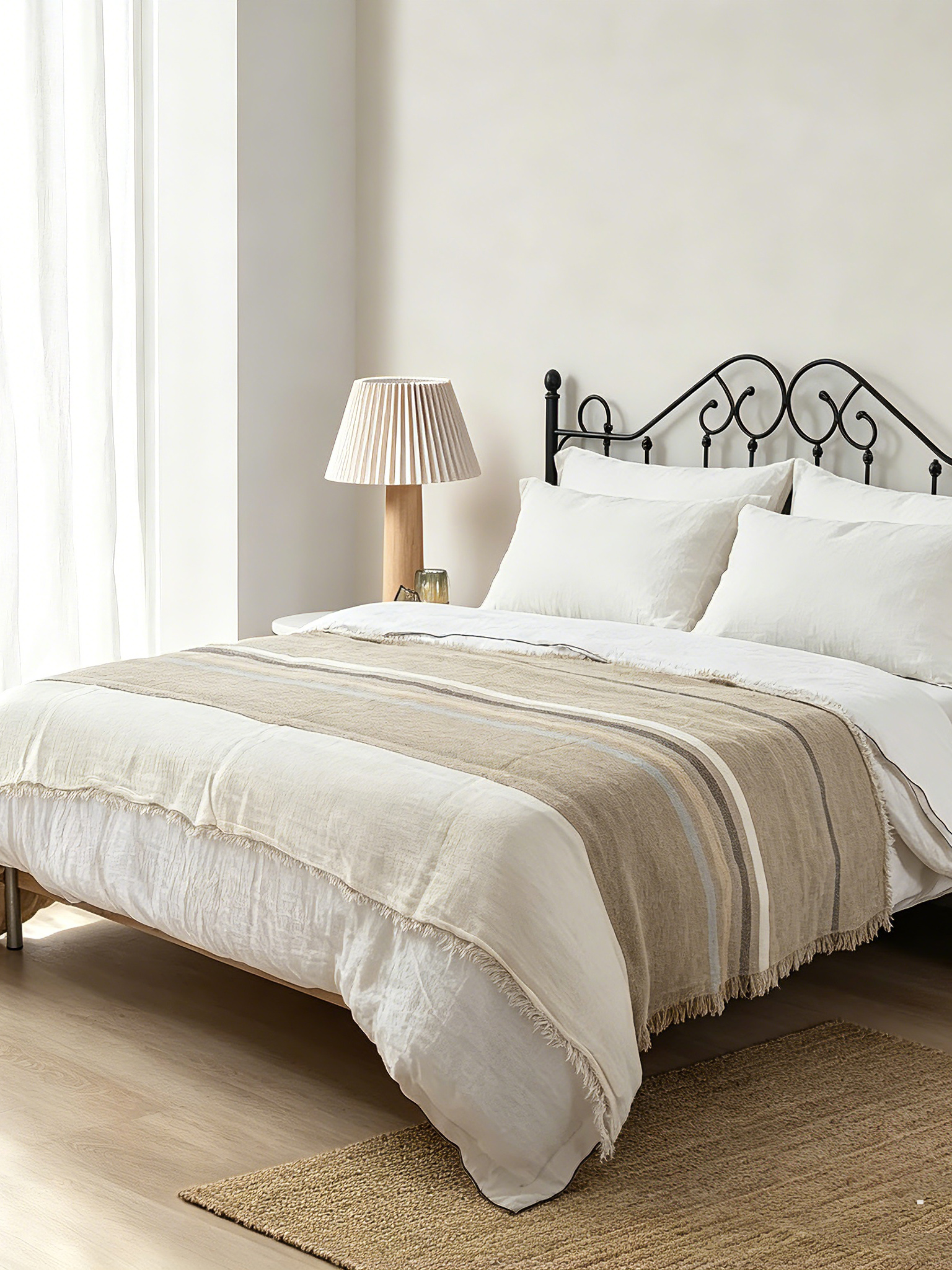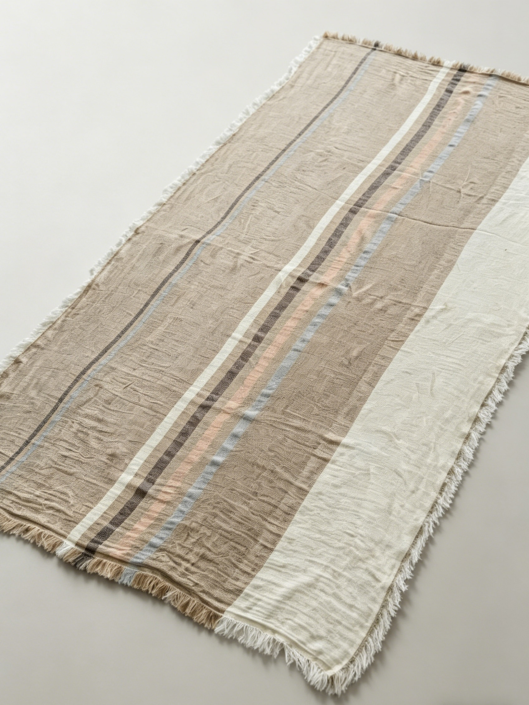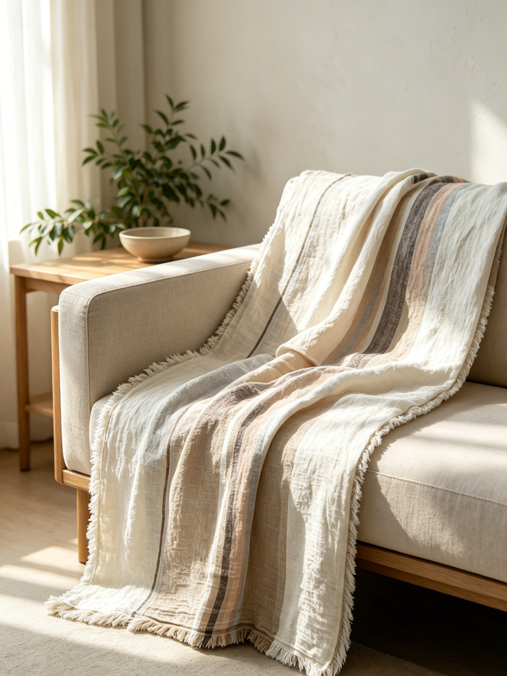 Designed with a soft natural sand base accented by muted grey, terracotta, blush, and white stripes, inspired by the earthy colors of sunlit coastal dunes, this throw complements any coastal, boho, farmhouse, or modern living space. The subtle contrast of the stripes adds a quiet, laid-back charm that pairs beautifully with both neutral and warm-toned interiors. The lightweight drape stays neatly in place when styled as a coastal throw for sofa living room decor, adding instant warmth and serenity to your home.