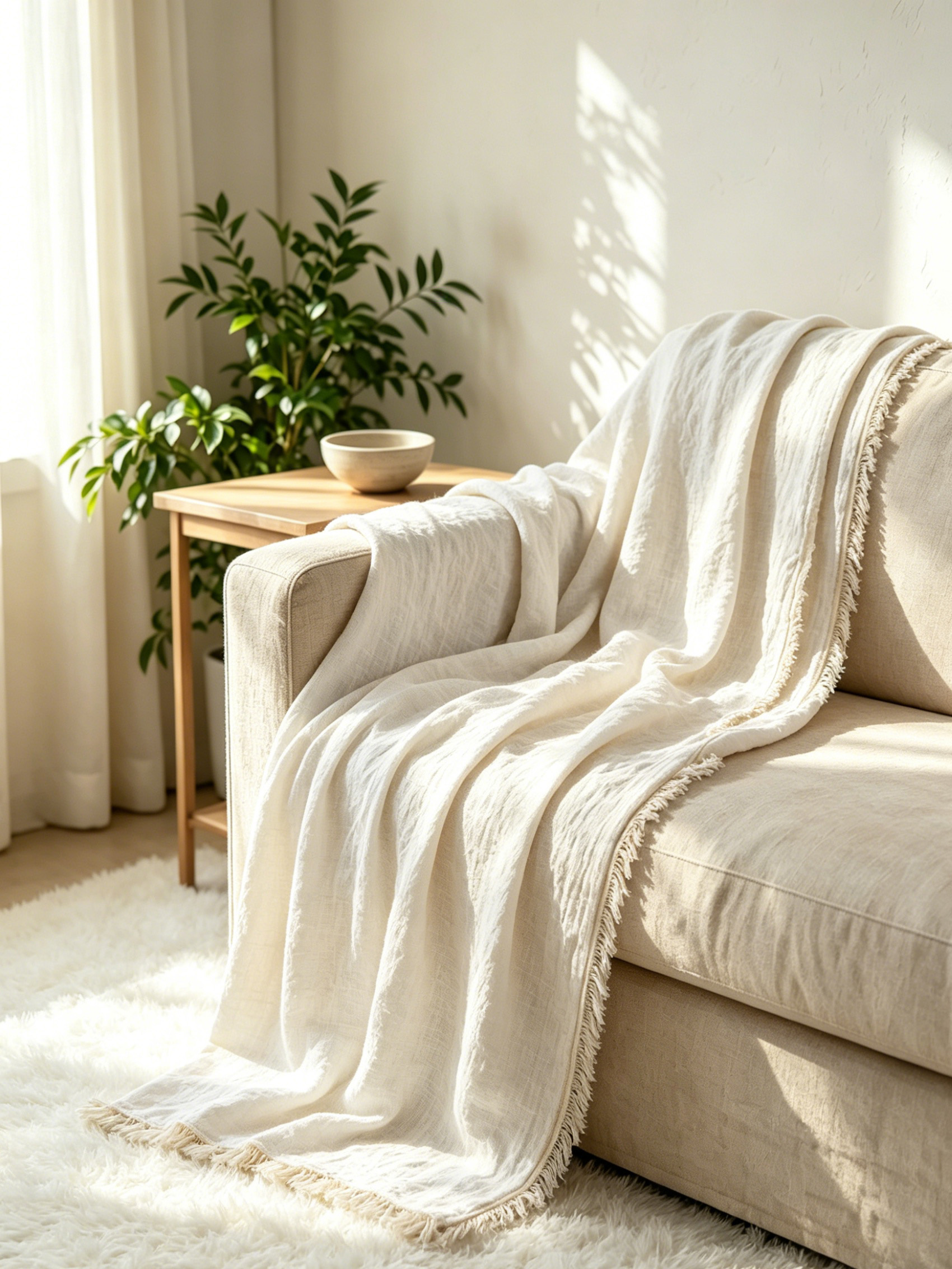 Designed in a soft, pure ivory hue inspired by sunlit coastal shores, this throw complements any coastal, boho, farmhouse, or modern living space. Its solid color palette with delicate frayed edges adds a quiet, laid-back charm that pairs beautifully with both neutral and light-toned interiors. The lightweight drape stays neatly in place when styled as a coastal throw for sofa living room decor, adding instant brightness and serenity to your home.