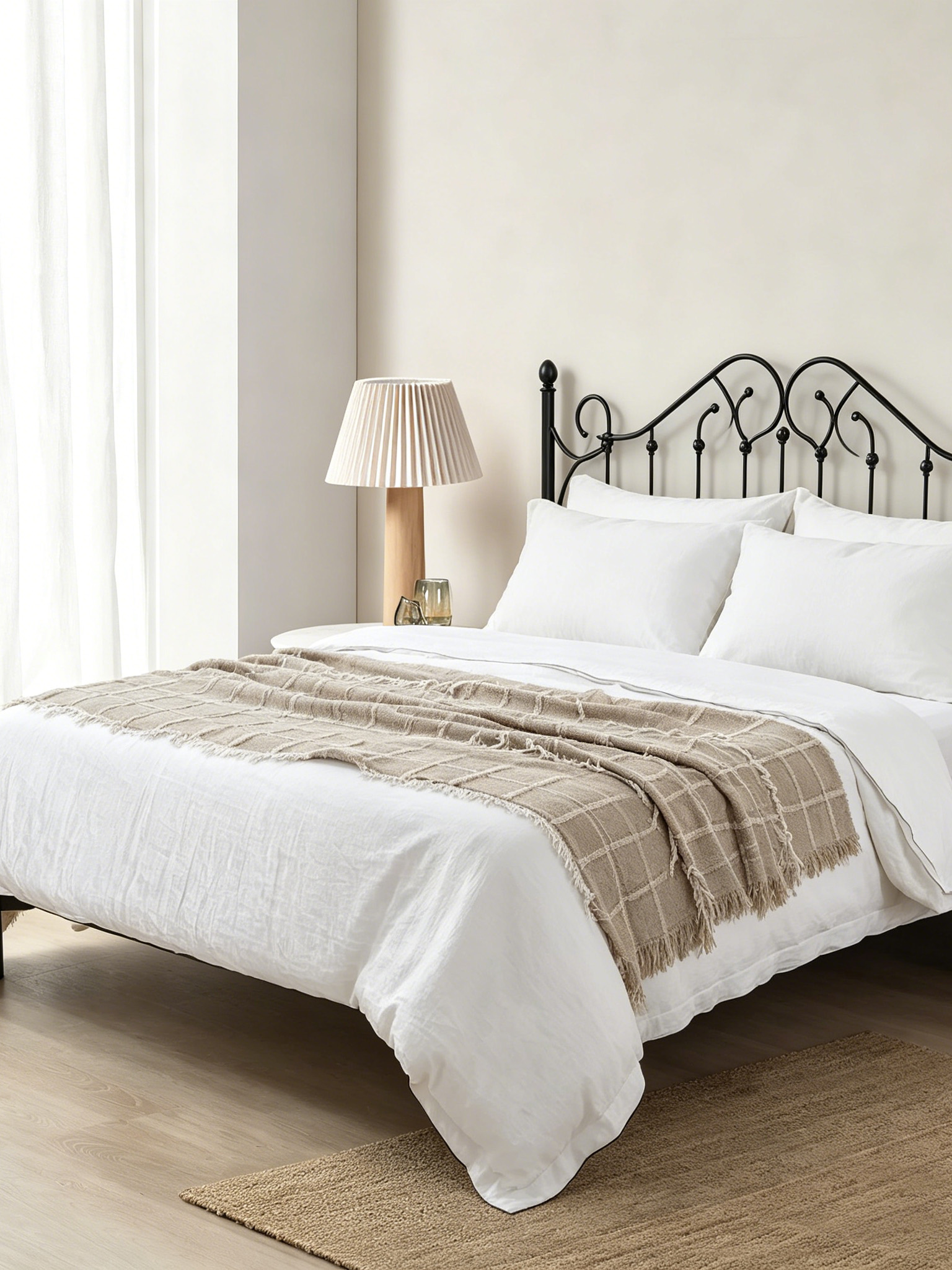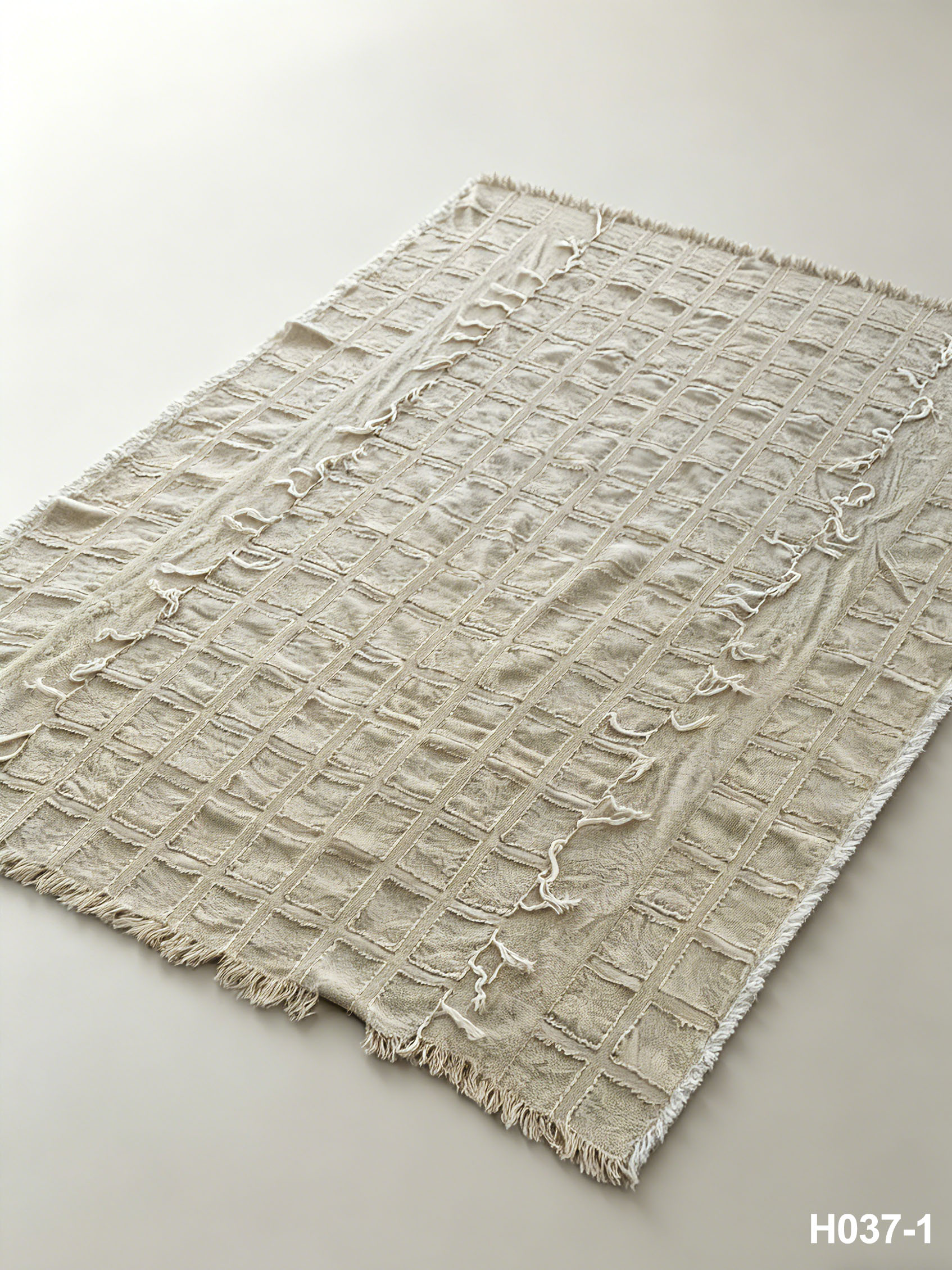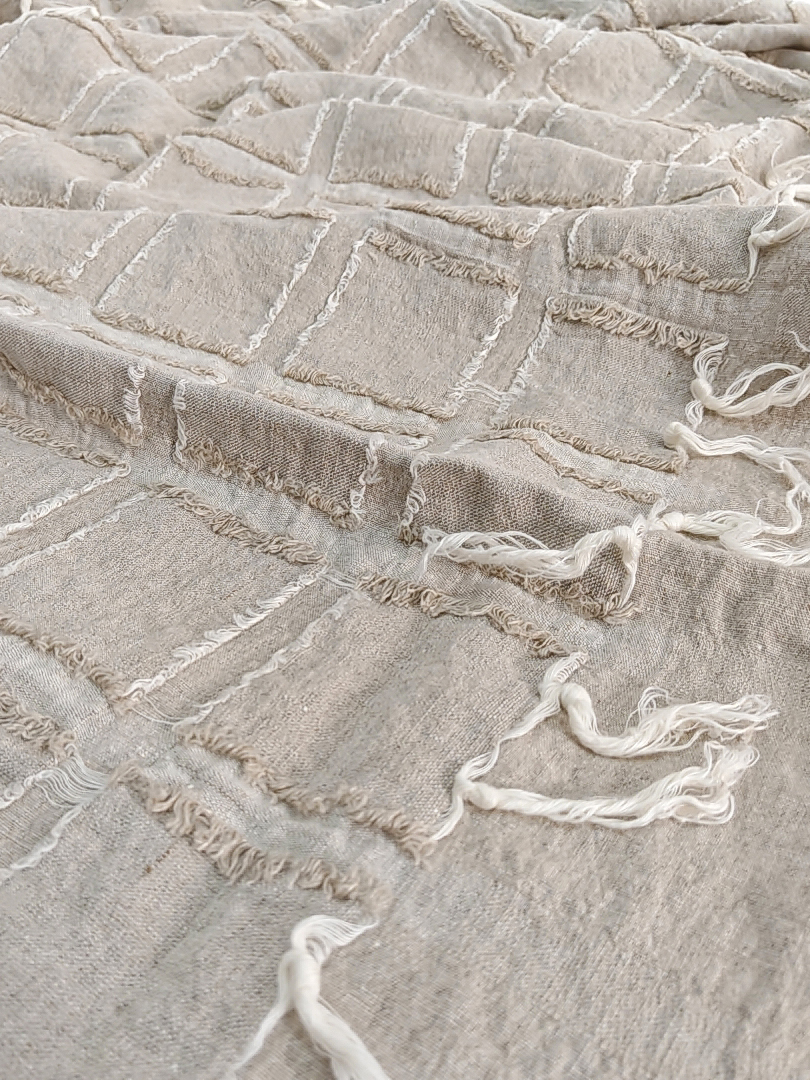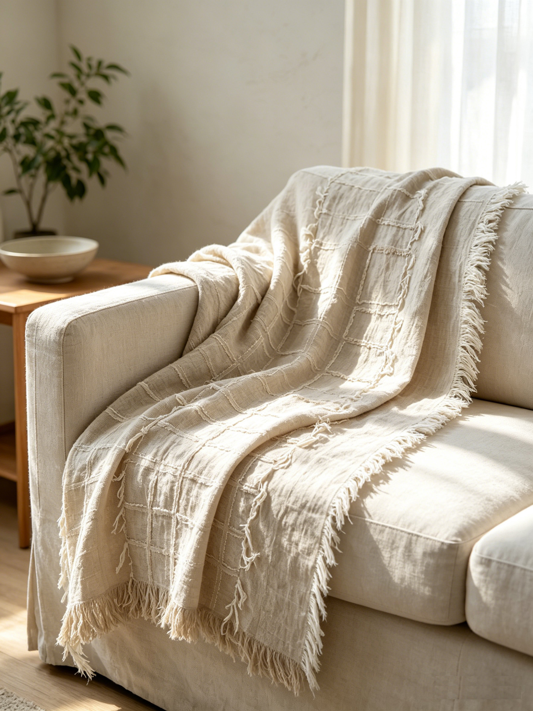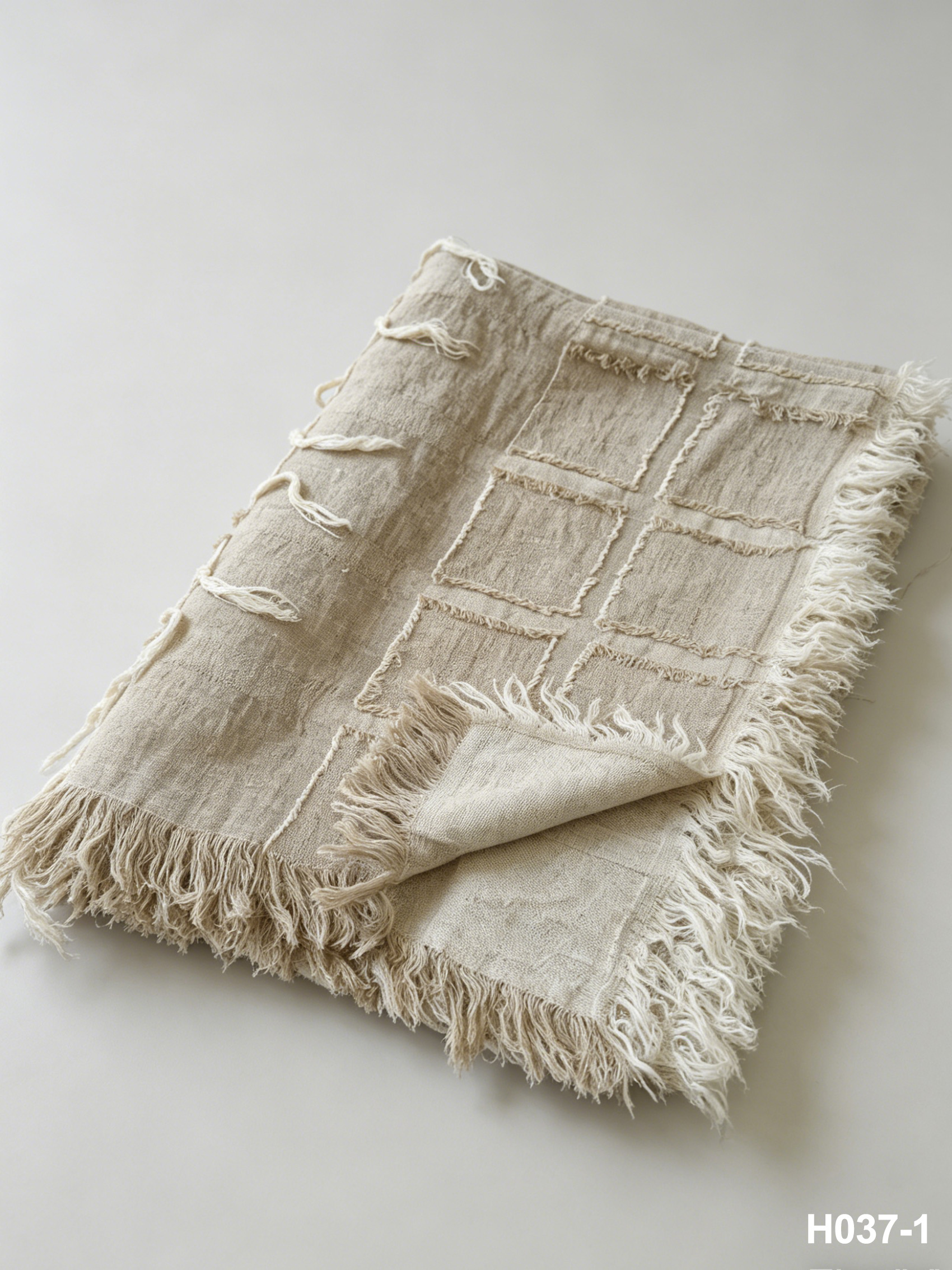 The classic minimalist square cutwork pattern presents subtle embossed details, while the soft natural linen tone pairs perfectly with coastal, wabi-sabi, nordic, japanese, modern farmhouse and french minimalist home styles. With an elegant drape and neat workmanship, it can be draped over sofas, accent chairs, bed ends and guest rooms, ideal for daily leisure naps, air conditioning covers and high-grade home soft decoration.
