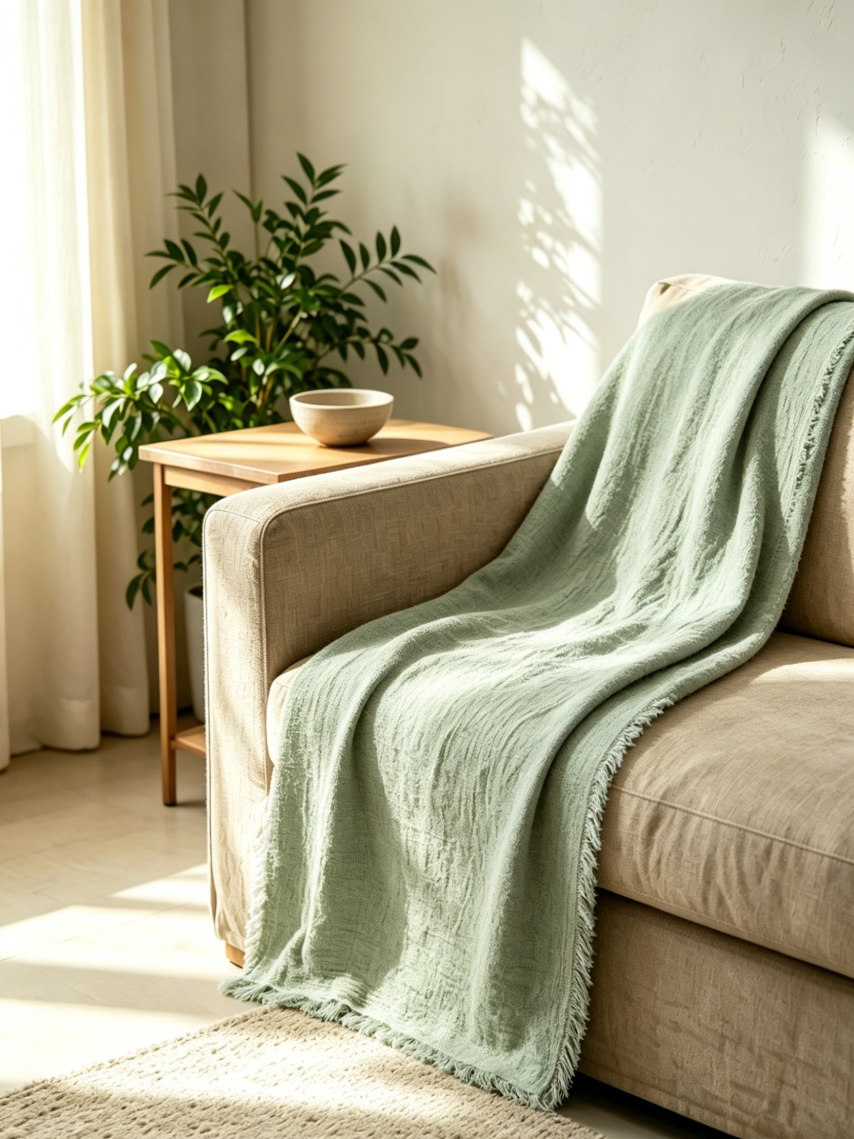 Designed in a soft, fresh sage green hue inspired by coastal foliage and calm sea foam, this throw complements any coastal, boho, farmhouse, or modern living space. Its solid color palette with delicate contrasting frayed edges adds a quiet, laid-back charm that pairs beautifully with both neutral and cool-toned interiors. The luxurious drape stays neatly in place when styled as a coastal throw for sofa living room decor, adding instant freshness and serenity to your home.