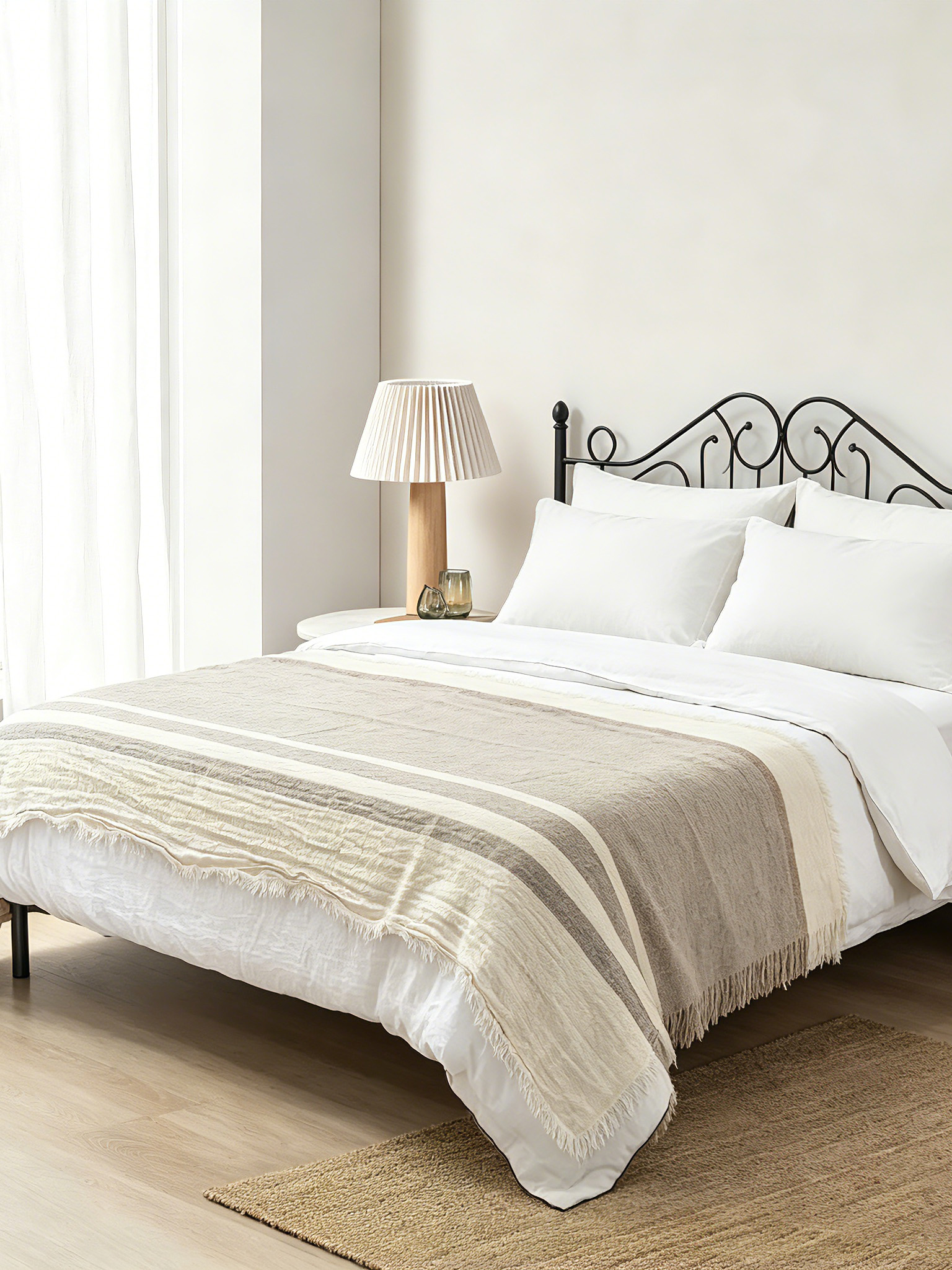 Designed with a natural linen base accented by soft sand-toned and blush stripes, inspired by the gentle patterns of wind-drifted beach sand, this linen throw complements any coastal, boho, farmhouse, or modern living space. The subtle contrast of the stripes adds an earthy, laid-back charm that pairs beautifully with both neutral and warm-toned interiors. The 380GSM weight provides a luxurious drape that stays neatly in place when styled as a coastal linen throw for sofa living room decor, adding instant warmth and sophistication to your home.
