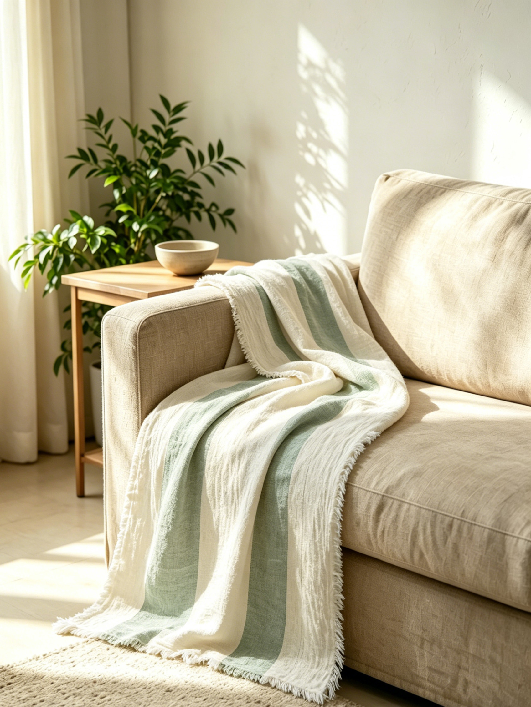 Designed with a bold, calming striped pattern inspired by the colors of a sunlit coastal shore—soft seafoam green paired with crisp white against a natural linen base—this linen throw complements any coastal, boho, farmhouse, or modern living space. The clean, contrasting stripes add a fresh, laid-back charm that pairs beautifully with both neutral and cool-toned interiors. The 405GSM weight provides a luxurious drape that stays neatly in place when styled as a coastal linen throw for sofa living room decor, adding instant brightness and serenity to your home.