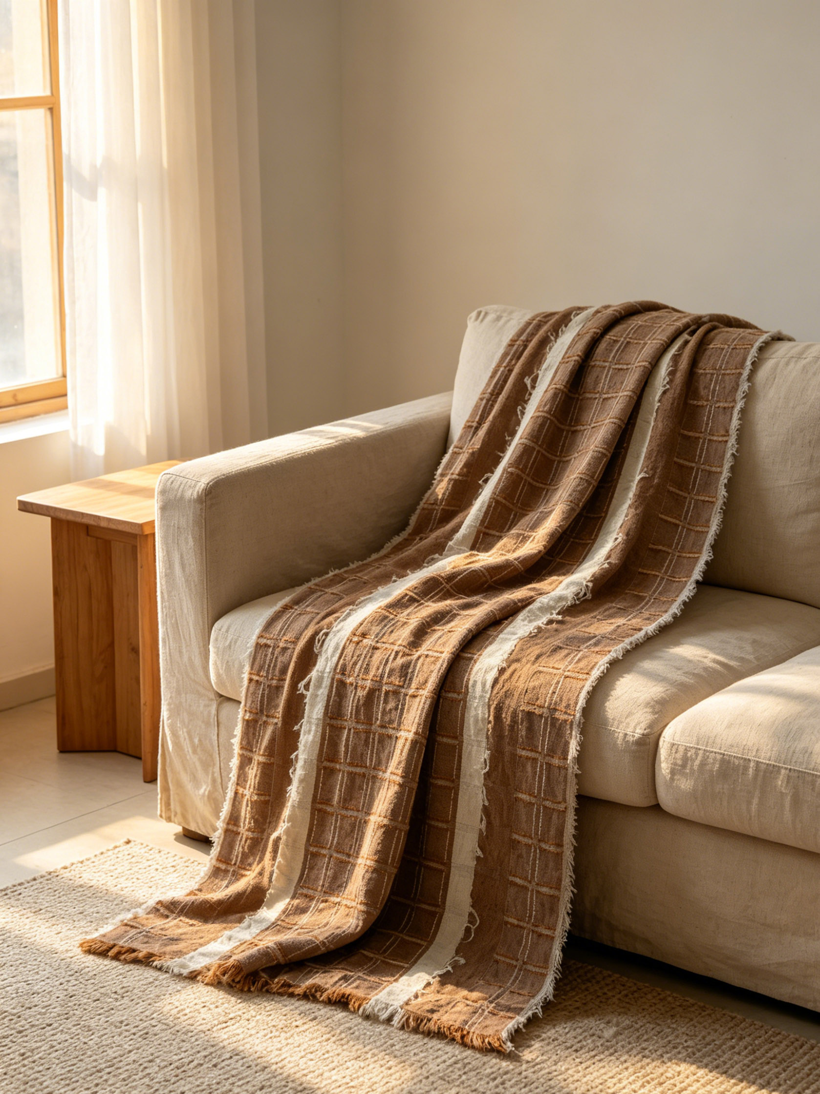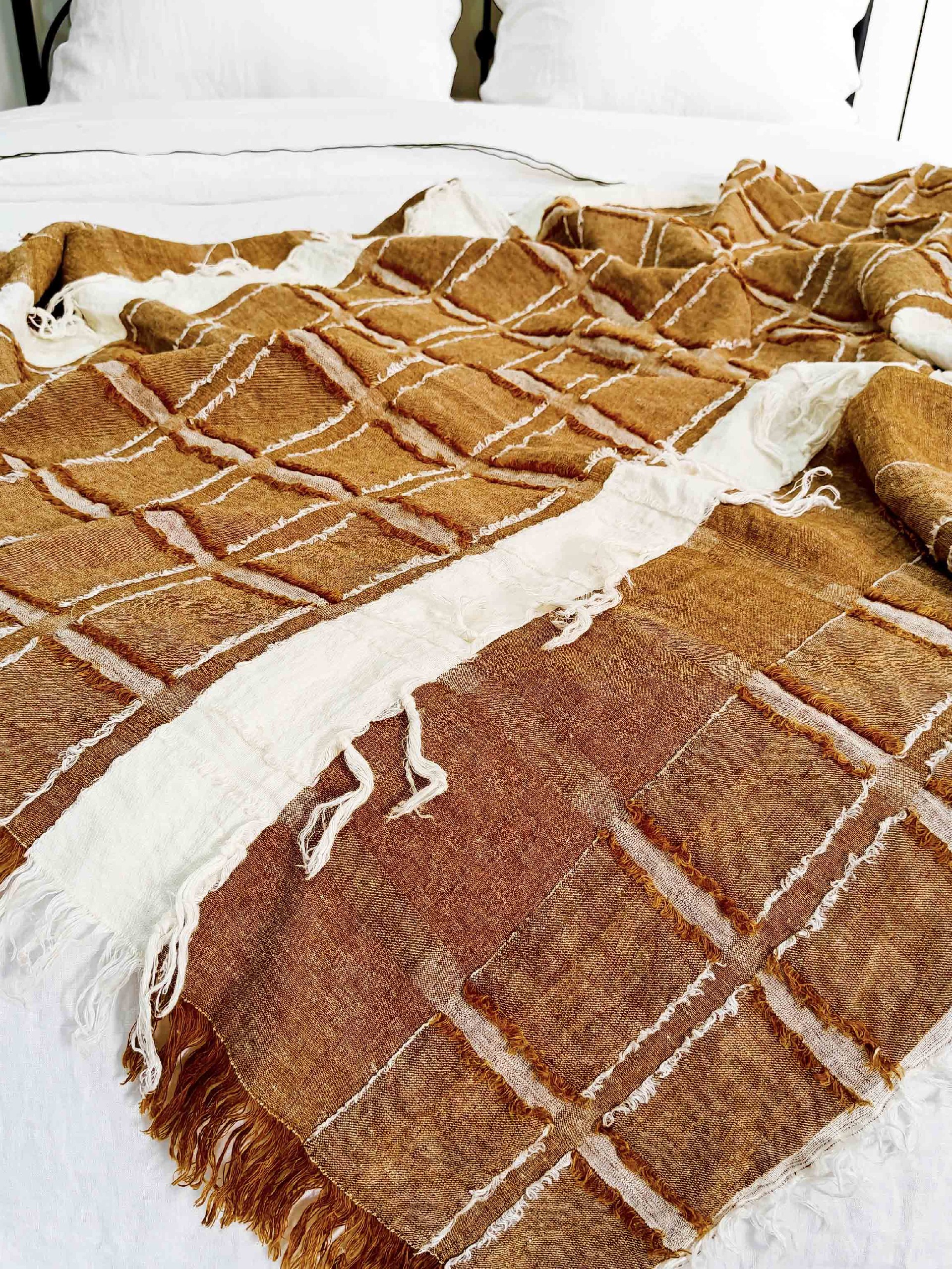 Terracotta Grid Stripe Cutwork Throw – Premium Coastal Linen Throw for Sofa Living Room Decor